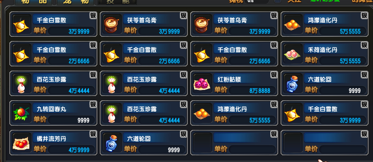 他们为什么有药店银票的药不买,要来买我们这些过千的定军散、百花散?这是一个疑问。OK,经验丰富的人已经知道是什么原因了。对,是技能。49剩50要求3个技能达到59级,而作为一名正常的玩家,他为了点那3个59级的技能已经是倾家荡产了。