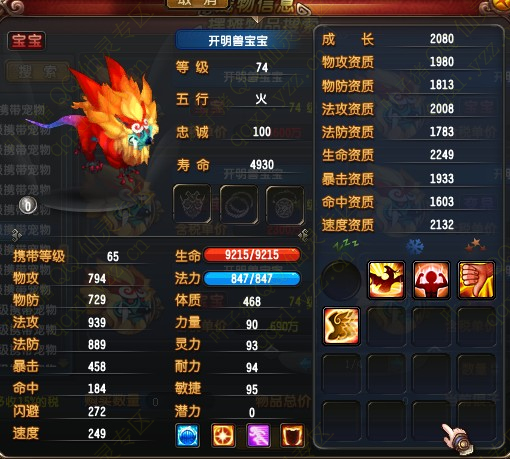 这只成长资质满的宝宝,物攻低啦。法攻还可以,别的一般啊!但是这个宝宝亮点在于其4个高红技能,实用性大,跟变异还是列逊一点。。。。